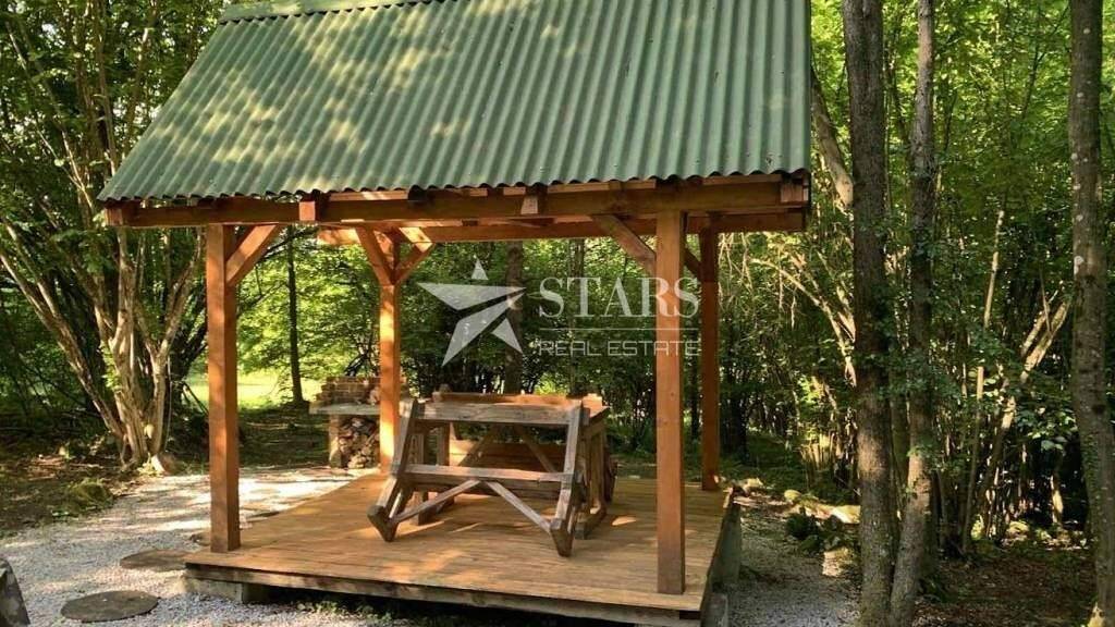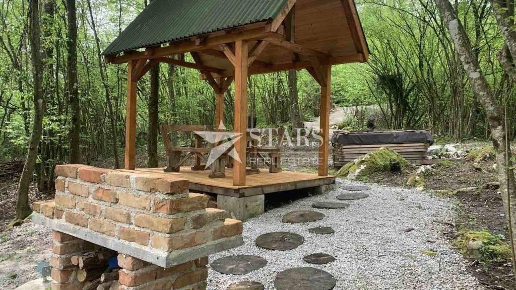 Das Grundstück ist eine Kombination aus Wald und Wiese und umfasst insgesamt 2.216 m². Auf dem Gelände befindet sich eine erhöhte 3×3 m große Überdachung, die auf Wunsch auch geschlossen werden kann. Auf dem angelegten Teil des Grundstücks steht zudem ein Grillplatz - ein idealer Ort für entspannte Stunden im zen-ähnlichen Naturambiente. Nur 70 m entfernt plätschert ein kleiner Bach. Ein vorbereiteter Parkplatz ist ebenfalls vorhanden.