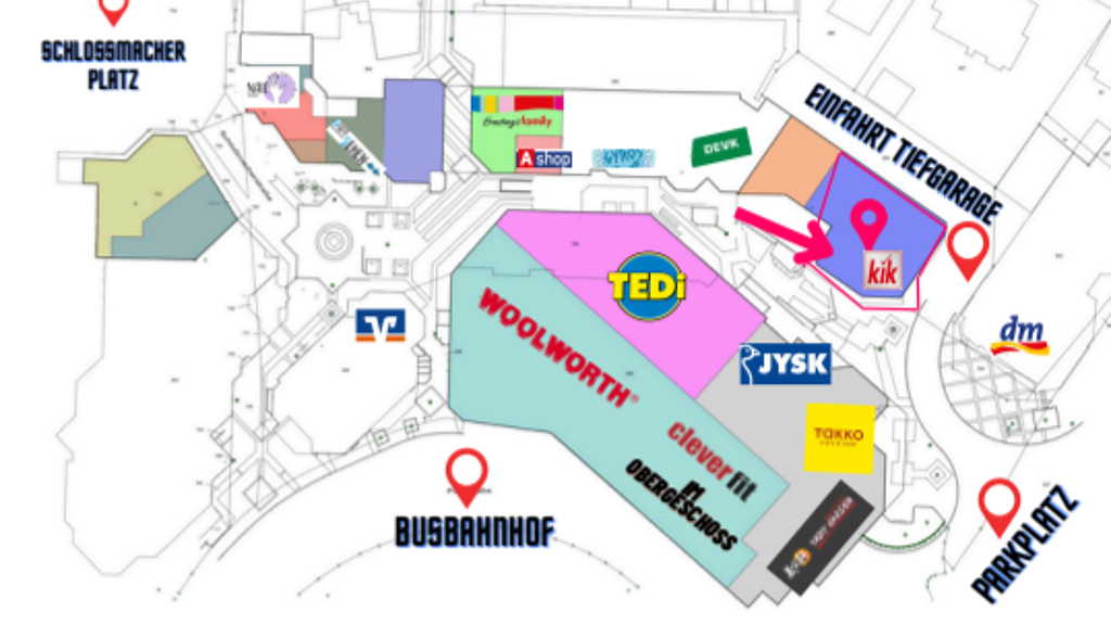 Das Ladenlokal liegt direkt an der Einfahrt zur Tiefgarage und einem weiteren Parkplatz Gegenüber befindet sich unser Mieter Takko. Das Ladenlokal befindet sich also unmittelbar an der Laufstraße von Tiefgarage und Parkplatz zur Galerie und Fußgängerzone.