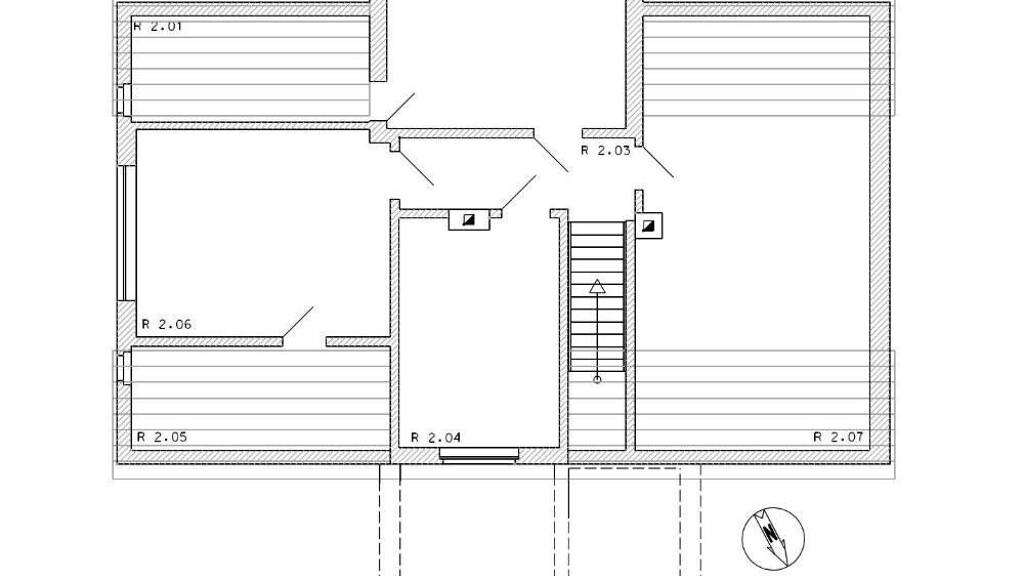Im Obergeschoss gibt es einen zweiten Flur, der in die einzelnen Räumlichkeiten führt. Nämlich in ein Bügelzimmer mit dem Zugang zu einer kleinen Kammer, zu einem größeren Zimmer mit einem Kachelofen und ebenfalls einem Zugang zu einer Kammer, zu einem kleineren Gästezimmer und zu dem noch ausbaufähigen Bodenbereich.