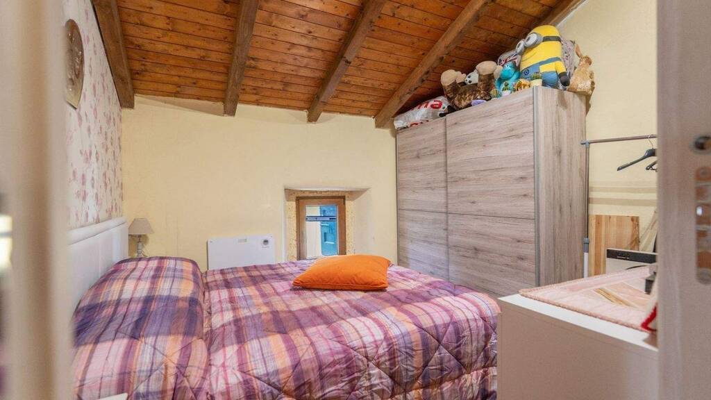 Im Obergeschoss befinden sich ein zweites Bad mit Fenster, ein Doppelzimmer und ein großer offener Raum, der derzeit mit zusätzlichen Schlafplätzen ausgestattet ist und durch freiliegende Holzbalken, die den Räumen Wärme und Authentizität verleihen, noch eindrucksvoller wirkt.