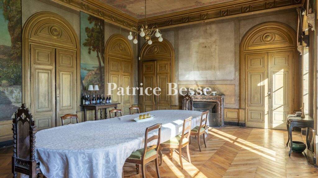 Double-leaf doors opposite the entrance lead to the main lounge and dining room that overlook the patio and the grounds. The main lounge boasts wood stripped flooring arranged in a specific pattern, as is the case in each room. It is decorated with gilded and painted wood-panelling set around the fireplaces and their overmantels. The dining room is brightened by painted upholstery depicting the décor and views of a former property on the French Riviera. There is uniquely patterned wood stripped flooring beneath the hand painted ceiling.
