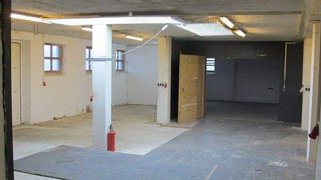 Die Halle mit 190 m² hat eine Raumhöhe von 2,70 m Das Einfahrtstor hat eine Breite von 2,30 m und eine Höhe von 2,45 m . Die Halle ist in zwei Räume aufgeteilt. Ein Hauptraum mit guter Beleuchtung und zahlreichen Stromanschlüssen versehen. Es handelt sich hier um Normalstrom und Starkstrom. Der kleinere Nebenraum ist mit einem großen Durchgang verbunden.