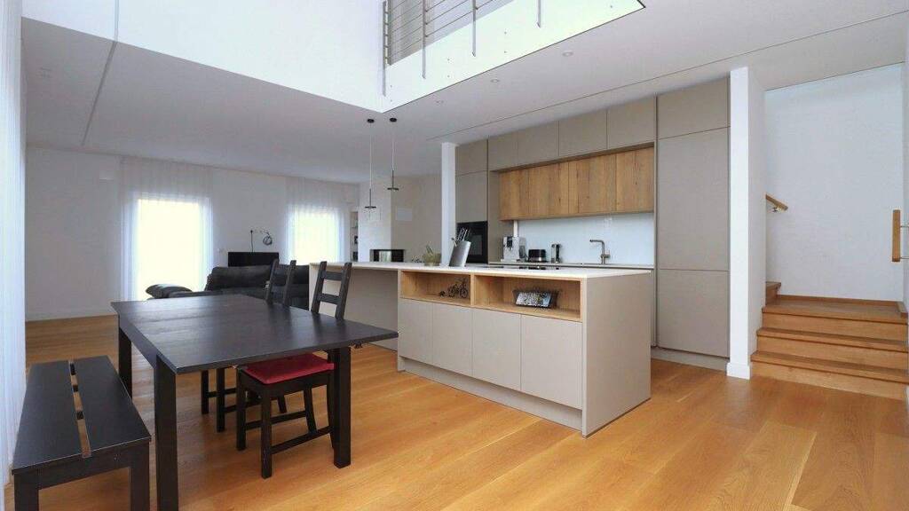 Die offene Designküche verbindet Ästhetik und Funktionalität auf höchstem Niveau. Hochwertige Materialien, grifflose Fronten und leistungsstarke Elektrogeräte der Marke NEFF garantieren besten Kochkomfort. Eine elegante Arbeitsplatte und modernste Technik machen diese Küche zum Mittelpunkt des Wohnens. Eine harmonische Erweiterung des Erdgeschosses bildet ein weiteres, vielseitig nutzbares, helles Zimmer, das sich ideal als stilvolles Homeoffice oder gemütliches Gästezimmer eignet.