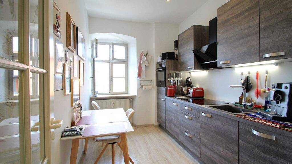 Auf einer Wohnfläche von ca. 60,71 m² überzeugt die Wohnung durch ihre hohen Decken und dem praktischen Grundriss. Das großzügige Wohnzimmer und das behagliche Schlafzimmer bieten viel Raum zum Wohlfühlen. Die separate Küche ist mit einer modernen Einbauküche ausgestattet, die bereits im Kaufpreis enthalten ist. Das innenliegende Badezimmer mit praktischem Oberlicht wurde - ebenso wie die gesamte Wohnung - modern renoviert. Strukturputz und hochwertige Bodenbeläge unterstreichen das geschmackvolle Wohnambiente.