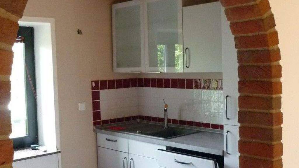Die Fußböden bestehen aus Stabparkett Echtholz Buche und Linoleum in der Küche.