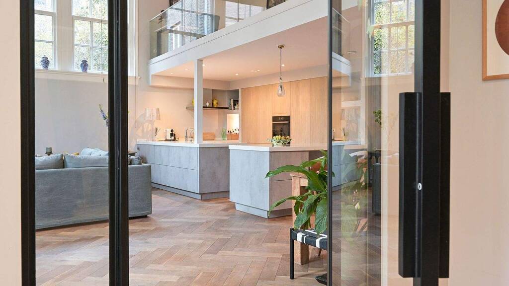 the first floor consists of a large l-shaped open space that can be utilized in various ways. currently, there are two lovely, bright workspaces here, but if additional bedrooms are needed, they can be created here.