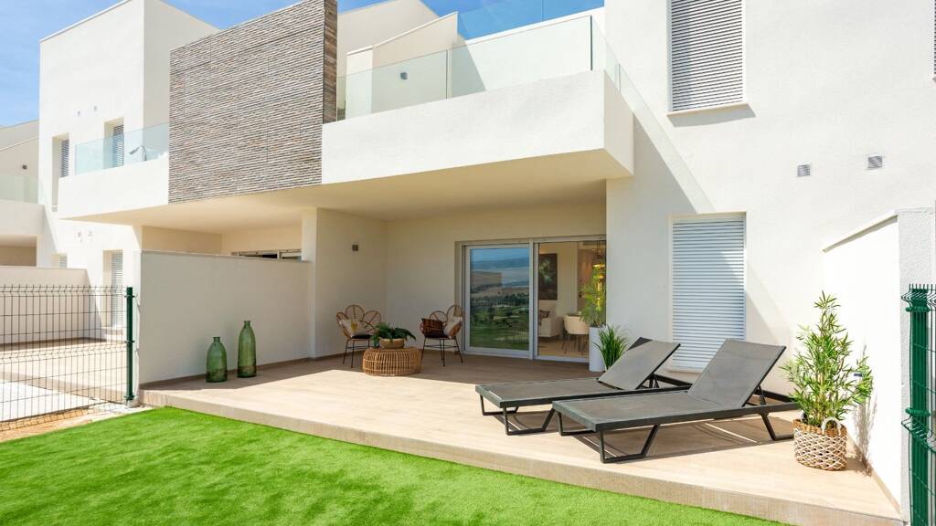 Die Apartments verfügen über einen offenen Wohn- und Essbereich, eine moderne amerikanische Küche mit separatem Hauswirtschaftsraum, ein Hauptschlafzimmer mit eigenem Bad, ein zweites Doppelschlafzimmer und ein Gästebad. Die Wohnungen im Erdgeschoss haben Zugang zu einer vorderen und hinteren Terrasse und die Wohnungen im Dachgeschoss haben Zugang zu einer großen Dachterrasse von 72m2 von einer Außentreppe auf der unteren Terrasse.