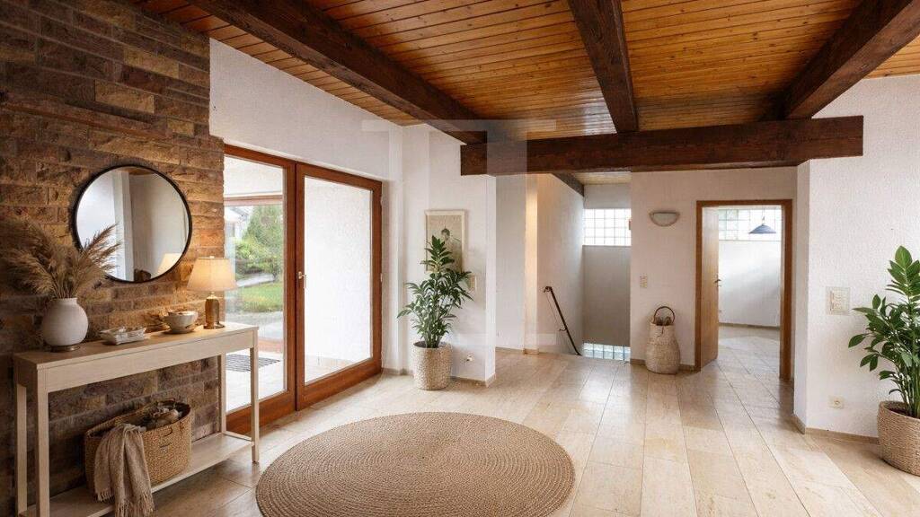 Schon beim Betreten des Hauses eröffnet sich ein besonderes Raumgefühl: Der großzügige Eingangsbereich empfängt Sie mit einem direkten Blick ins Grüne und schafft ein angenehmes Raumgefühl. Auf der Hauptwohnebene im Erdgeschoss erwarten Sie insgesamt vier gut geschnittene Zimmer, darunter ein helles Schlafzimmer, ein gemütliches Kinderzimmer sowie ein einladender Wohn- und Essbereich. Ein stilvoller Kamin dient hier nicht nur als Blickfang, sondern auch als atmosphärischer Raumtrenner.