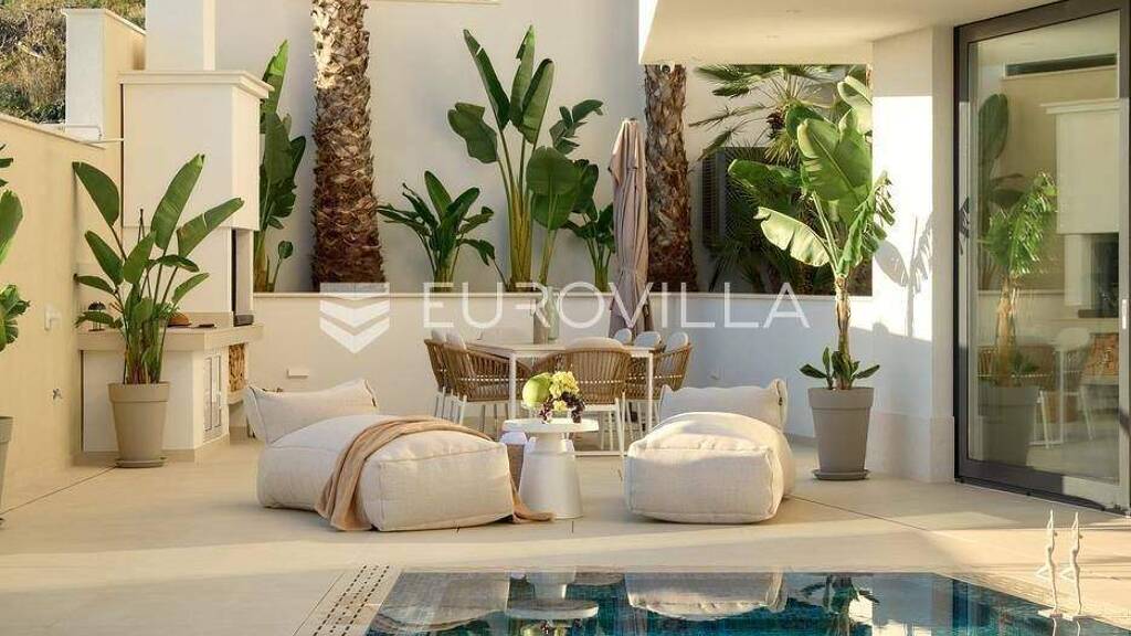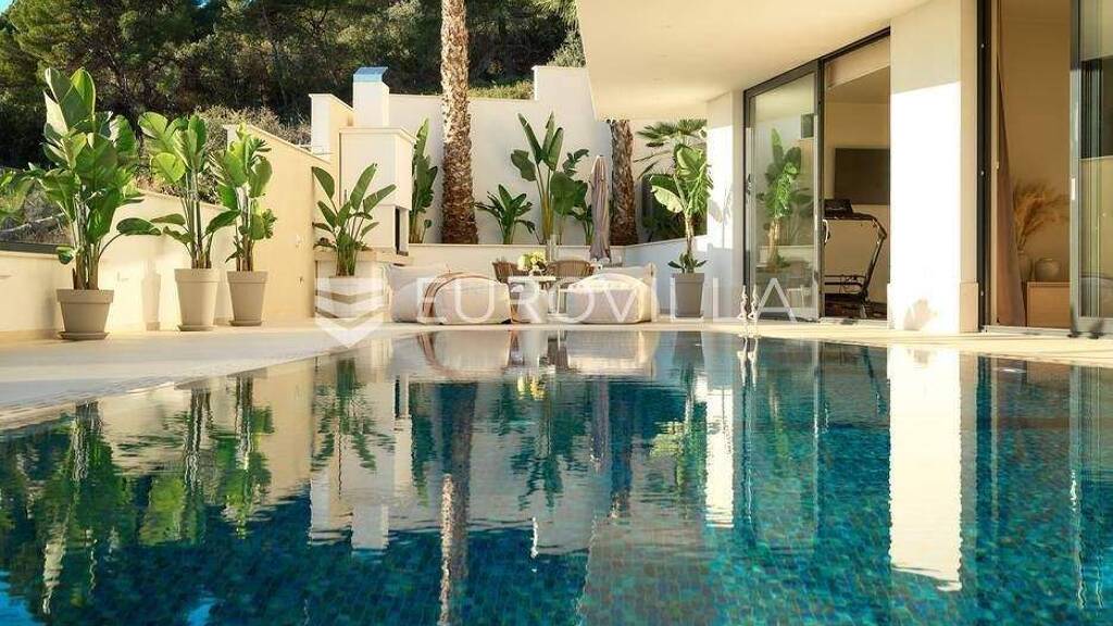 Na jednoj od najatraktivnijih lokacija otoka Ciova, u neposrednoj blizini povijesnog Trogira, nalazi se ova izvanredna moderno dizajnirana vila. Svojom povisenom pozicijom, suvremenom arhitekturom i besprijekornim standardima gradnje, vila pruza rijetko iskustvo luksuza i potpunog komfora, uz neometan panoramski pogled na more.Smjestena na parceli od 560 m², vila nudi 351 m² elegantno organiziranog zivotnog prostora rasporedenog na tri etaze, s vrhunskim materijalima, promisljenim detaljima i opremom koja zadovoljava najvise kriterije modernog stanovanja.Suteren - Zona opustanja i hedonizmaUdobnost i privatnost glavna su obiljezja suterena, u kojem se nalaze:profesionalno opremljen fitness prostorsaunaprostor za zabavukupaonica, praonica i strojarnicaOva razina otvara se na veliku terasu s blagovaonicom na otvorenom, rostiljem, preljevnim bazenom povrsine 31 m2 s grijanim masazama i protustrujnim valovima, jacuzzijem i prostranim suncalistem - idealnim mjestom za potpuno opustanje s pogledom na more.Prizemlje - Privatna oaza udobnostiNa prizemlju se nalaze tri luksuzne spavace sobe, svaka s vlastitom kupaonicom i pristupom zajednickoj lodi povrsine 18,8 m². Ovoj razini pripada i garaza za dva vozila (31 m²) s izvrsenom pripremom za punionice za elektricna vozila, sto dodatno naglasava suvremeni karakter vile.Prvi kat - Impresivan dnevni prostor i vrhunski pogledNajvisa etaza rezervirana je za:prostran dnevni boravak od 52 m²dodatnu kupaonicucetvrtu spavacu sobudvije velike terase (15 m² i 38 m²) s neometanim pogledom na moreKomunikacija svih etaza osigurana je elegantnim unutarnjim stubistem.Tehnicka izvrsnost i materijali visoke klaseVila je gradena i opremljena prema strogim standardima premium nekretnina:stropni klima uredaji visoke kvaliteterekuperacija zrakapodno grijanje putem dizalica topline8 cm termoizolacije (stiropor)aluminijska stolarijastaklene ograde na terasamaprovedene instalacije za ugradnju solaraautomatsko navodnjavanje vrtovasustav videonadzoradodatna dva nenatkrivena parkirna mjestaPosebna paznja posvecena je uredenju okolisa i hortikulturi, cime je stvoren skladan i mediteranski ambijent.Udaljenosti od kljucnih sadrzajaMore / plaza: 250 mTrgovina: 500 mRestoran: 400 mLjekarna: 1 kmTrogir: 1,5 kmZracna luka Split: 6,5 kmGrad Split: 27 kmOva vrhunski uredena vila predstavlja rijetku priliku na trzistu luksuznih nekretnina - spoj sofisticiranog dizajna, moderne tehnologije i nezamjenjive lokacije s pogledom koji oduzima dah. Idealna je kao luksuzna obiteljska rezidencija ili kao prestizna investicija s izvanrednim potencijalom za turisticki najam.Naravno, za sva dodatna pitanja ili posjet lokaciji stojimo na raspolaganju.... Vise na eurovilla.hr, ID: 170091
