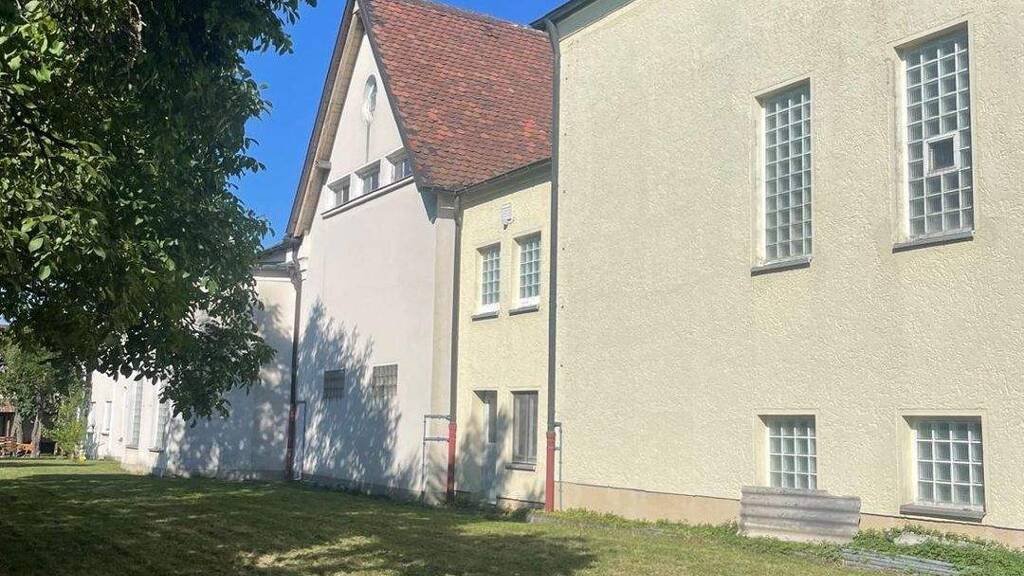 Der zweite Gebäudeteil auf der rechten Grundstücksseite vereint funktionale Büro- und Nutzflächen mit dem zentralen Heizungsraum, über den das gesamte Anwesen - einschließlich des Einfamilienhauses auf der linken Seite - beheizt wird.