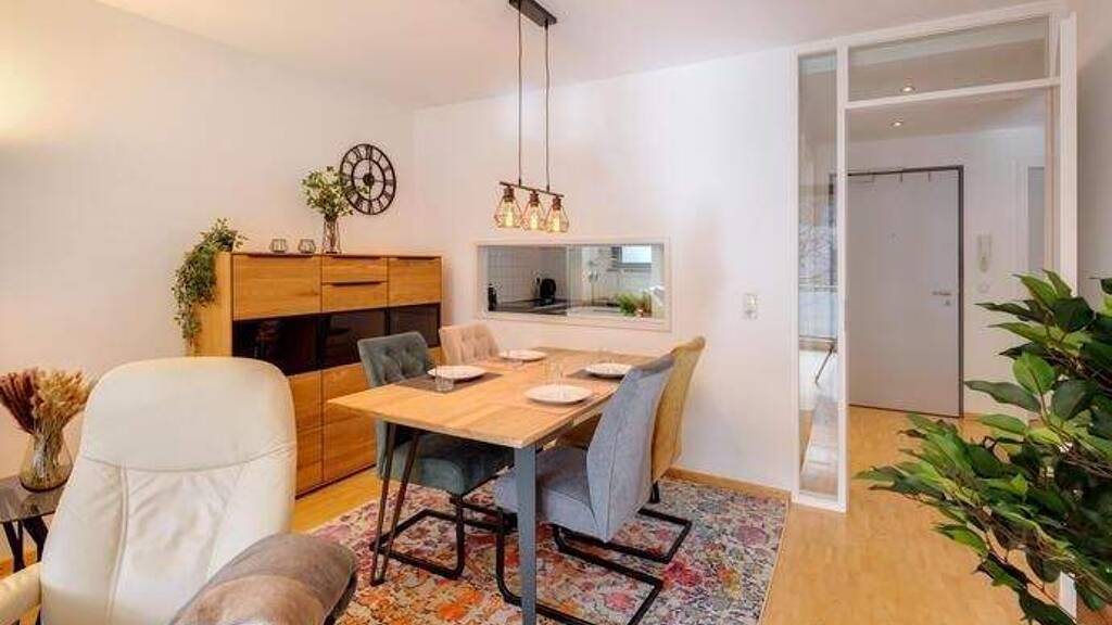 Die Wohnung liegt sehr ruhig, da alle Fenster zu zwei Innenhöfen ausgerichtet sind. Sie verfügt über 2,5 Zimmer sowie einen großzügigen Balkon, der zusätzlichen Freiraum zum Entspannen bietet. Der Wohn- und Essbereich ist mit einer modernen Ledersitzgruppe inklusive Schlafcouch und einem einladenden Essplatz ausgestattet. Die Küche besitzt eine praktische Durchreiche zum Wohn-/Esszimmer. Sämtliche Möbel - mit Ausnahme der Küche - sind komplett neu. In Wohn-, Schlaf- und Arbeitszimmer werden voraussichtlich Mitte März neue Vorhänge montiert.