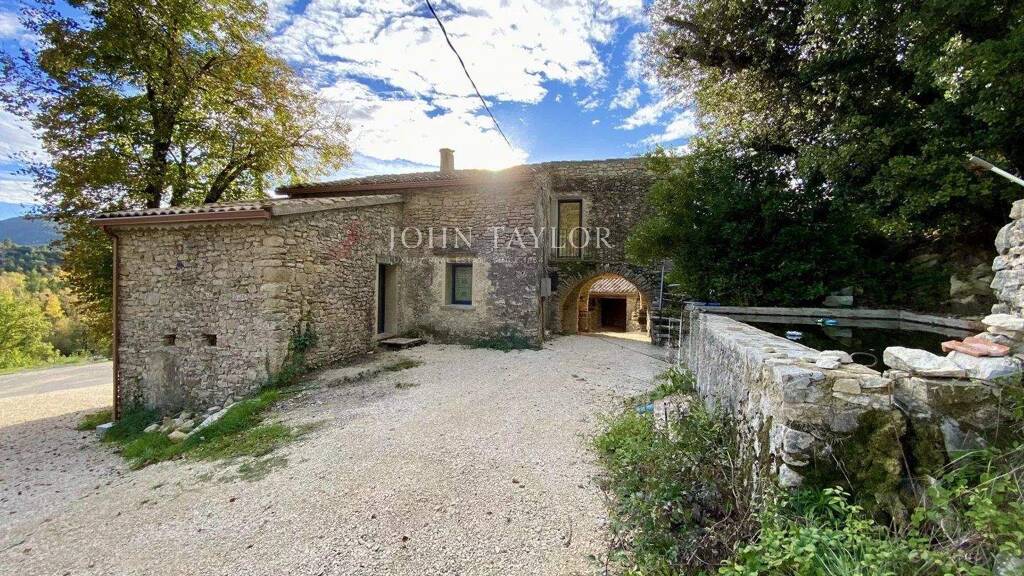 Les extérieurs dévoilent un ensemble de tableaux naturels : une piscine aux lignes simples de 10x5 en cours de travaux, un bassin alimenté par une source, des terrasses façonnées par le temps, un accès rivière et une large dépendance adossée à la roche, dans laquelle subsistent un four ancien et une cave voûtée d'une remarquable authenticité. L'ensemble dessine un décor vivant, changeant au fil des saisons et des lumières.