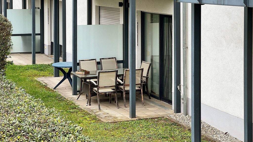 Geradeaus ist das Herzstück des Apartments, der ca. 20 Quadratmeter große Wohn-, Ess- und Kochbereich. Diesem schicken und gemütlichen Raum schließt sich die Terrasse mit der kleinen zusätzlich umgebenen Rasenfläche an.