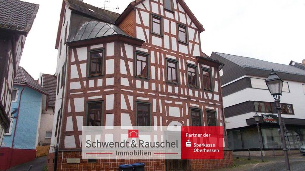 Ein freistehendes Fachwerkhaus aus der Gründerzeit mit Deckenhöhen um die 2,60 m, eigenen Stellplätzen + kleinem Garten, inmitten der malerischen Altstadt von Schotten haben wir hier für Sie.