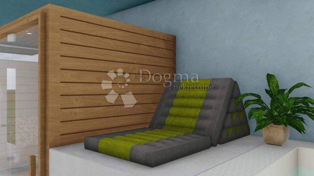 Das Haus besteht aus einem Erdgeschoss mit einer Fläche von 30m2, in dem ein Wellnessbereich vorgesehen ist, d.h. ein Hallenbad und eine Sauna, wie in der Visualisierung dieser Anzeige, deren Inhalt nach den Wünschen gestaltet werden könnte Käufer, und der Hauspreis läge dann bei 220.000 Euro.