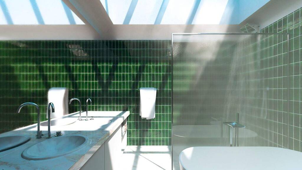 Das Bad ist hochwertig ausgestattet und verfügt über eine Glasüberdachung, die für angenehmen Tageslichteinfall sorgt und den Raum zusätzlich aufwertet.