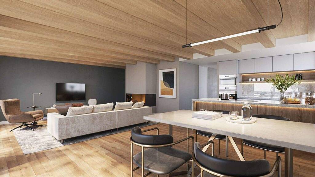 Der großzügige Wohn-, Ess- und Küchenbereich bildet das Zentrum der Wohnung und öffnet sich über große Fensterflächen zur Südwest-Terrasse. Diese bietet einen hochwertigen privaten Außenbereich und ist mit einem Whirlpool ausgestattet - ideal für entspannte Stunden im Freien. Im Wohnbereich sorgt ein Kamin für eine angenehme, wohnliche Atmosphäre.