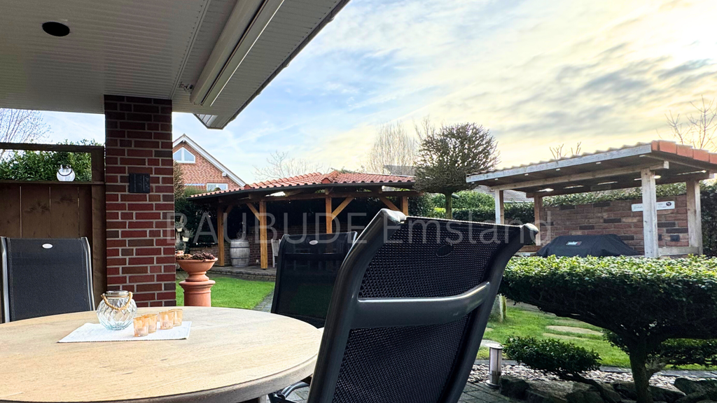 Im Außenbereich steht eine überdachte Terrasse mit Markise zur Verfügung sowie ein Grillplatz mit fester Gartenlaube.