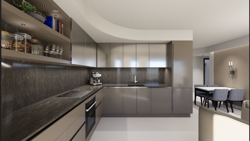 Voll ausgestattete Küche mit integrierten Elektrogeräten