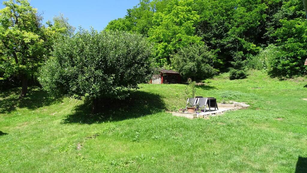 Das Grundstück hat ca. 1400 m² auf dem zwei Garagen (24 m² und 15 m²), ein Carport, Nebengebäude, der Erdkeller sowie ein Brunnen und Obstbäume stehen.