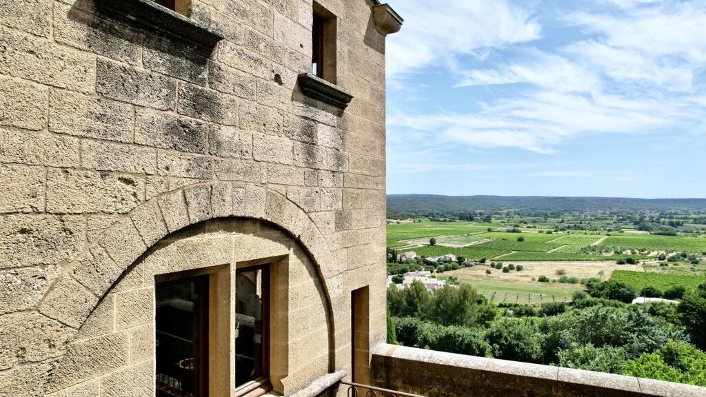 From the spiral staircase or the lift, the first floor offers a second living area. Two lounges of 43 and 25 m2 offer spacious accommodation and old-world charm: mullioned windows, ceiling beams, solid wood parquet flooring and terracotta floor tiles. Unique views over an unspoilt panorama, the landscaped courtyard, the surrounding countryside, vineyards, farmland, hills and the Alpilles. A wrap-around balcony provides a small, refreshing outdoor space from the large lounge overlooking one of the village's ancient gateways.
