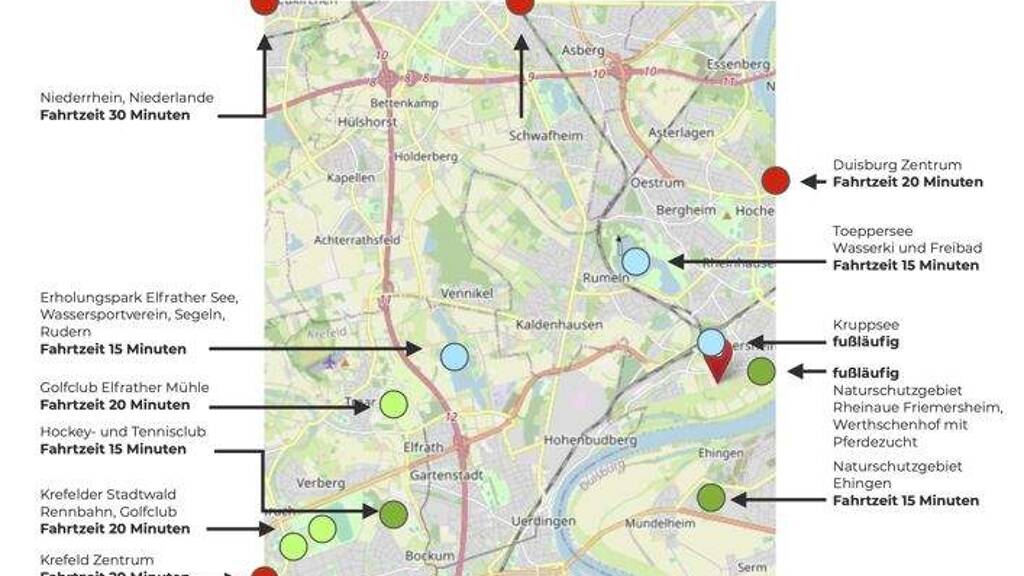 Der fußläufig entfernte Kruppsee mit Freibadanlage, die naturgeschützten Rheinauen mit ihren Hecken, Weiden und Obstwiesen, gepflegte romantische Rad- und Wanderwege am Rhein entlang bis nach Krefeld, der nahe gelegene Golfclub Elfrather Mühle...