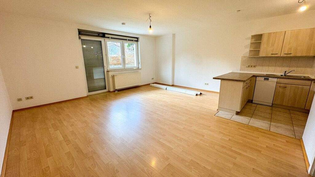 Die Wohnung verfügt über einen großzügigen Wohnbereich mit Ausgang zur großen Terrasse und offenen Küchenbereich mit vorhandener Einbauküche, ein Schlafzimmer sowie Badezimmer mit Wanne.
