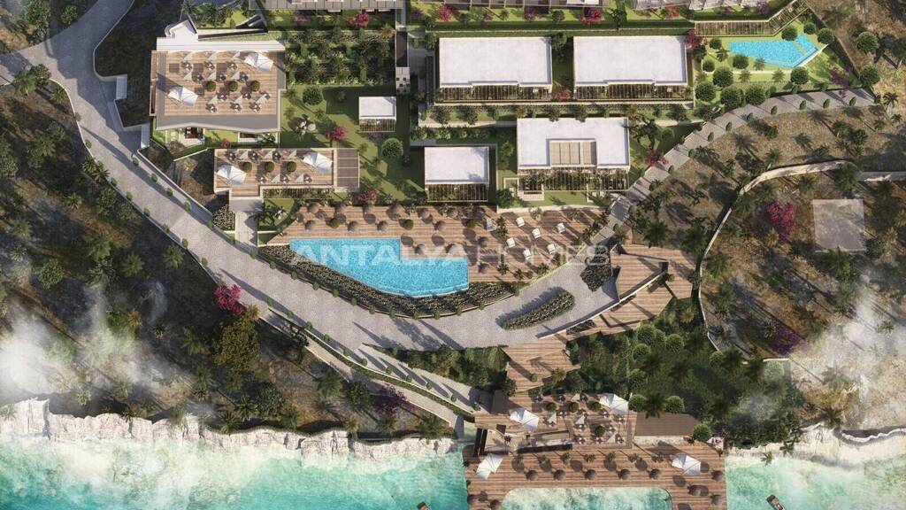 Bezugsfertige Wohnungen befinden sich in einem luxuriösen Strandkomplex in Yalikavak, die über Panoramablick auf das Meer verfügen, mit einen privaten Steg, Schwimmbäder, Spa, Café und vieles mehr.
