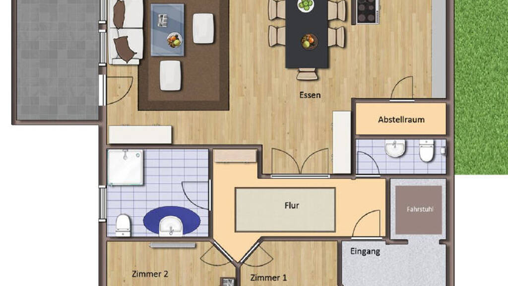 Aufteilung: Flur, Gäste- WC, Wohnbereich mit offener Küche nebst Hochglanzeinbauküche, Abstellraum und Ausgang zur überdachten Terrasse , Schlafzimmer, Gäste-Zimmer und Tageslichtbad mit Eckdusche, Waschbecken, Handtuchtrockner, Waschmaschinenanschluss und WC.