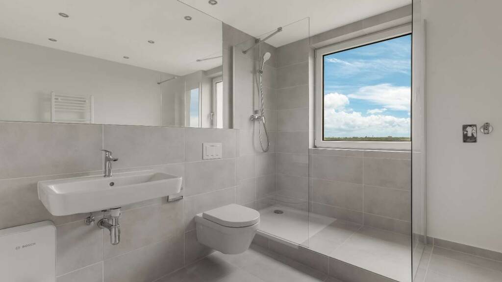 Auch das moderne Badezimmer lässt keine Wünsche offen. Großformatige Fliesen in hellgrau geben dem Badezimmer einen stilvollen Look. Es wurden hochwertige Armaturen von GROHE und Keramik von Villeroy & Boch verbaut. Zudem verfügt das Duschbad über einen Waschmaschinenanschluss.