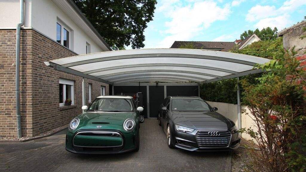 Der große Doppelcarport vor dem Haus verfügt über eine Wallbox. Angrenzend befindet sich ein geräumiger Schuppen für Fahrräder und Gartengeräte.