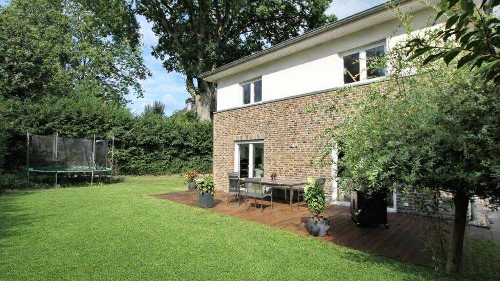 Der Garten ist uneinsehbar. Die zum Garten ebene Terrasse ist aus hochwertigem Bankiraiholz. Der Garten ist pflegeleicht angelegt und die Rasenpflege erledigt der Roboter.