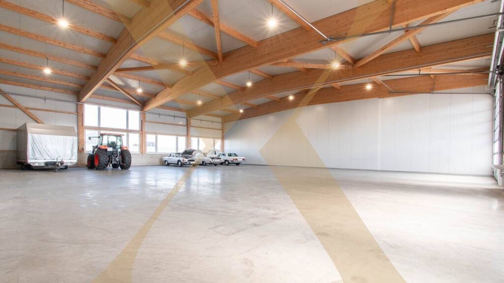 Diese vielseitig nutzbare Lagerhalle verfügt über eine Hallenfläche von ca. 475,33m² sowie einen Vorplatz von ca. 99,5m². Sie ist mit einem ebenerdigen Rolltor (ohne Rampe) ausgestattet, das einen effizienten Warenumschlag und Produktionsabläufe ermöglicht.