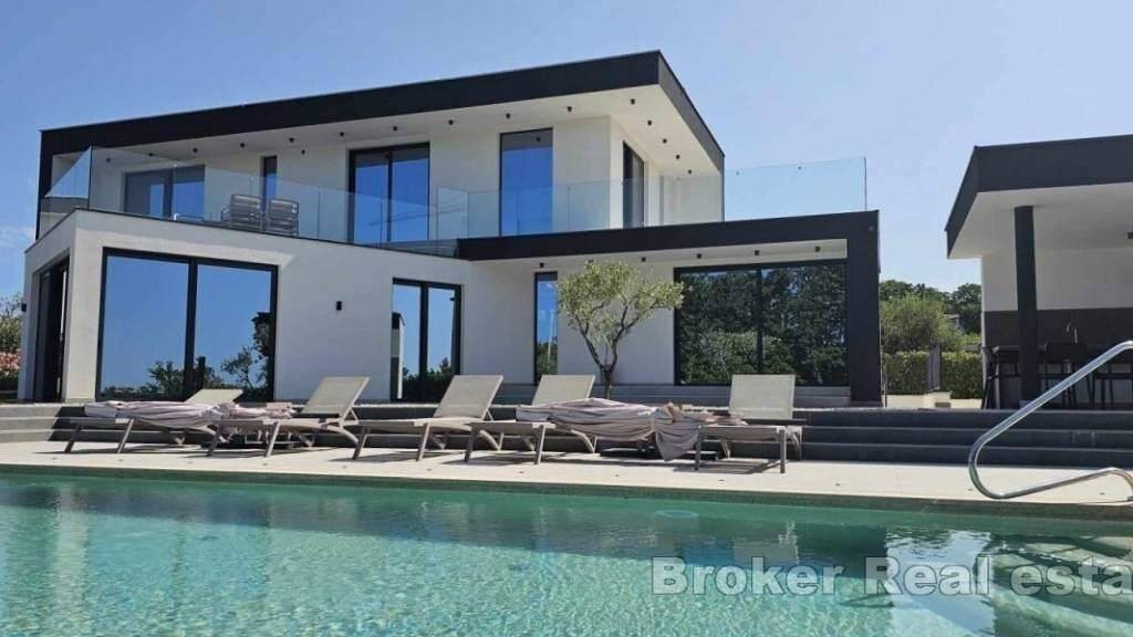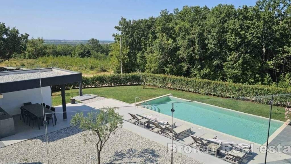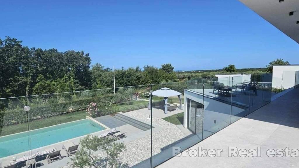Luxuriöse, moderne Villa in ruhiger Lage, 9 km von der Küste und 12 km von der Stadt Porec entfernt. Sie befindet sich auf einem Grundstück von 1450 m2, von denen 306 m2 Wohnfläche sind. Sie besteht aus Keller, Erdgeschoss und Obergeschoss, also vier Schlafzimmern und insgesamt sechs Badezimmern. Der Wellnessbereich mit Sauna, Whirlpool und Fitnessraum befindet sich im Keller der Villa.