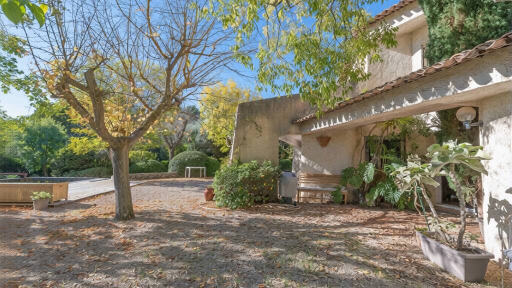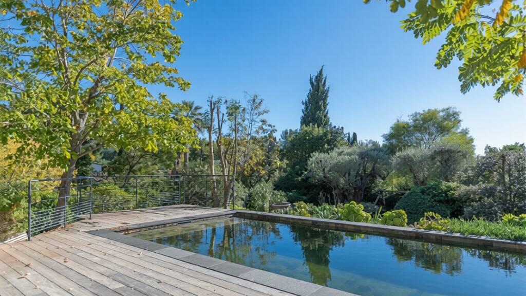 The landscaped grounds host a superb Bali-stone swimming pool, perfectly suited for enjoying the Mediterranean climate in a lush, private setting. A major asset of the property is its location within a zone allowing 25 percent building footprint, offering outstanding potential for extension, redesign, or bespoke development.