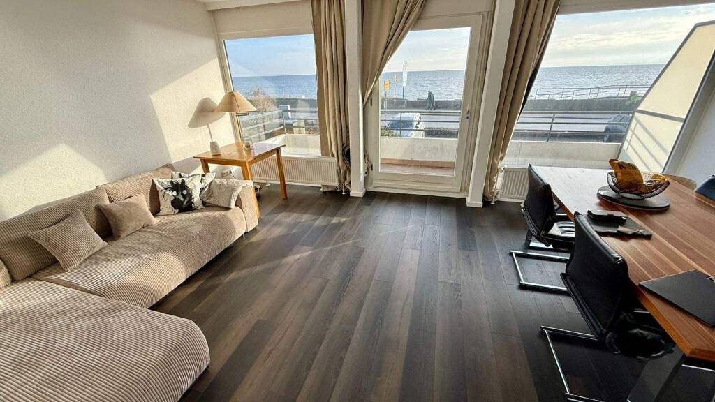 Die Wohnung präsentiert sich in einem modernisierten, sehr gepflegten Zustand und wurde innerhalb der letzten zwei Jahre umfassend renoviert. Das neue Badezimmer verfügt über eine bodentiefe Dusche mit moderner Glasabtrennung, zeitgemäßer Sanitärausstattung und einem ansprechenden Fliesenbild, das gut zur maritimen Umgebung passt. Die Einbauküche wurde ebenfalls erneuert und bietet mit Ober- und Unterschränken, Cerankochfeld, Backofen und weiteren Elektrogeräten eine zeitgemäße Ausstattung auch für längere Aufenthalte. Die Bodenbeläge in der gesamten Wohnung wurden durch moderne, dunkle Beläge ersetzt, die einen harmonischen Kontrast zu den hellen Wänden bilden und den Räumen eine klare, ruhige Linie geben.