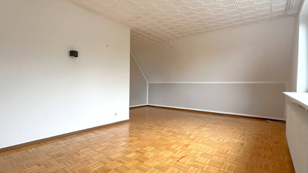 Die Dachgeschosswohnung beherbergt drei geräumige Zimmer, eine Küche und ein Duschbad.