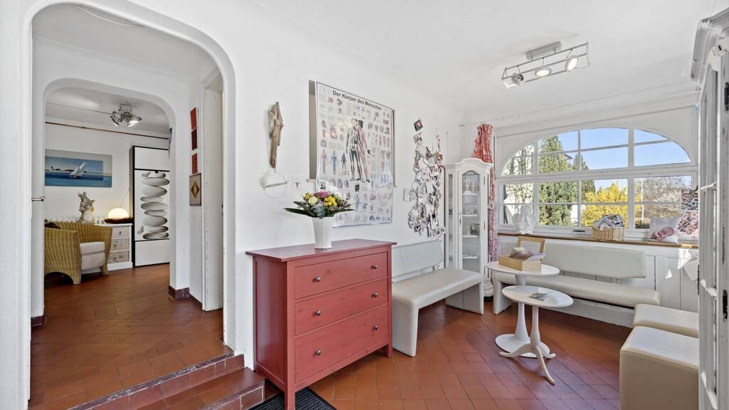 Das Erdgeschoss empfängt mit dem Eingangsbereich des Hauses und erschließt einen Bereich, der sich besonders vielseitig nutzen lässt. Hier befinden sich ein Praxisraum, ein Technikraum, ein separates Tageslichtbad mit WC sowie ein charmanter Gewölbekeller, der den historischen Charakter der Immobilie auf besondere Weise unterstreicht. Gerade der Praxisraum eröffnet interessante Perspektiven für das Arbeiten im eigenen Haus und eignet sich ebenso als Büro, Behandlungsraum oder individuell nutzbarer Bereich.
