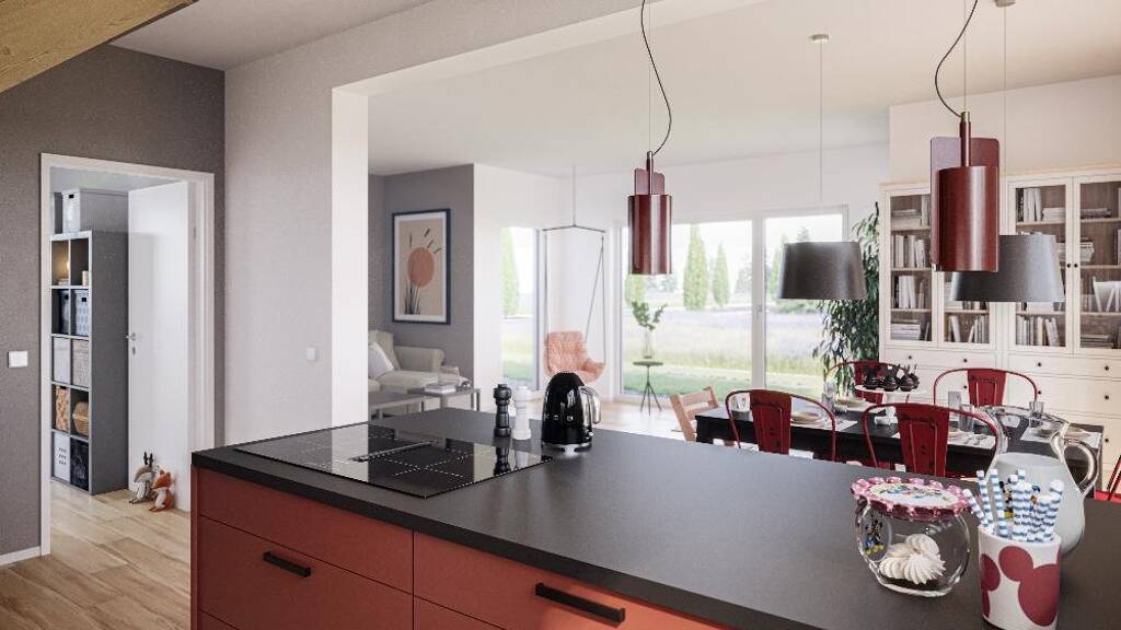 Dieses LivingHaus ist ein wahres Meisterwerk der Individualität und Funktionalität. Mit einer Wohnfläche von 130 Quadratmetern bietet es genügend Raum für deine kreativen Ideen und individuellen Wünsche. Hier verschmilzt Minimalismus mit dem Traum vom Eigenheim, denn auf über 130 Quadratmetern kannst du dich voll entfalten. Im Erdgeschoss lädt der großzügige Wohn- und Essbereich mit einer eleganten Kücheninsel zum Verweilen ein. Ein separates Arbeitszimmer, eine praktische Garderobe und ein Gäste-WC ergänzen das Raumangebot perfekt. Das Obergeschoss besticht durch ein geräumiges Schlafzimmer mit integrierter Ankleide, ein stilvolles Badezimmer sowie zwei gemütliche Kinderzimmer. Eine offene Galerie bietet zusätzlichen Platz zur freien Gestaltung.