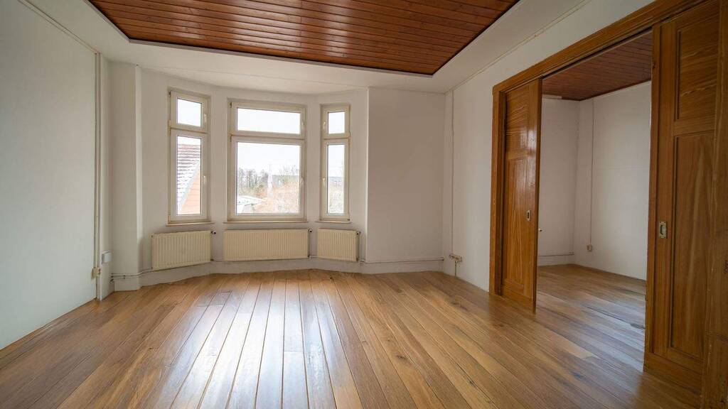 Die Wohnung beeindruckt mit einer großzügigen Deckenhöhe von über 3 Meter, im Flur und Wohnzimmer liegen die alten Dielenbalken als Boden. Das Wohnzimmer hat eine Doppelschiebetür zu einem Nebenraum als Erweiterung. Das Badezimmer verfügt über zwei Waschbecken, eine Badewanne und eine seperate Duschkabine. Aus der Küche heraus geht ein Zugang zur Dachterrasse welche gut sichtgeschützt ist.