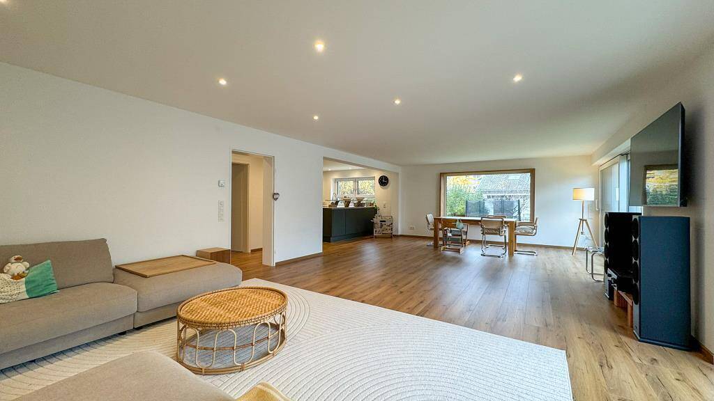 Dieses hochwertig kernsanierte Einfamilienhaus mit Einliegerwohnung liegt ruhig und familienfreundlich in einer Sackgasse ohne Durchgangsverkehr. Die angrenzende, unbebaute Grünfläche hinter dem Haus schafft einen harmonischen Übergang zur Natur und bietet ein hohes Maß an Privatsphäre.