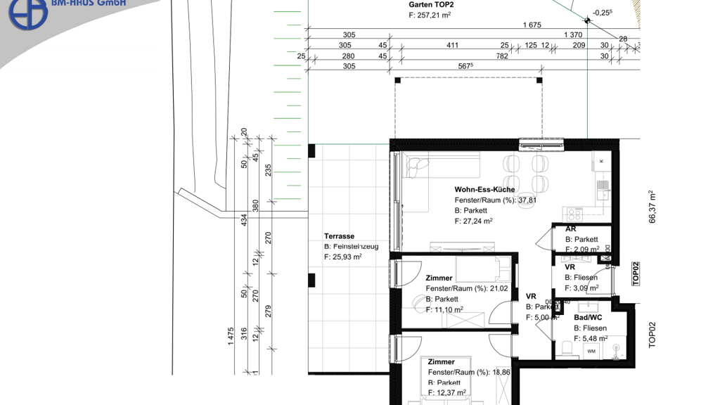 Die TOP 2 im EG besteht aus einem Vorraum, einen Wohn- Esszimmer mit Küche, zwei Schlafzimmern, Bad/WC und einem Abstellraum. Zur Immobilie gehören weiters ein Grünflächenanteil im Eigentum von ca. 257 m², eine Terrasse mit 26 m², ein Kellerabteil und ein TG-Platz.