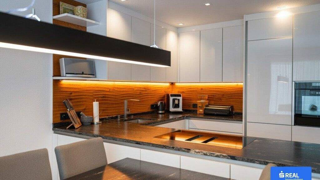 Mit einer Wohnnutzfläche von rund 90 m² bietet diese 4-Zimmer-Wohnung ein perfekt abgestimmtes Raumkonzept für anspruchsvolle Lebensstile. Der großzügige Wohn- und Essbereich öffnet sich über raumhohe Fensterfronten zum sonnigen Balkon (ca. 30,5 m²) - ein herrlicher Platz für entspannte Stunden mit Blick auf die umliegende Bergwelt. Im Winter reicht der Fernblick südlich bis zum Kitzsteinhorn und westlich bis zum Kitzbüheler Horn - ein alpines Panorama, das seinesgleichen sucht. Die maßgefertigte Einbauküche mit edlen Steinoberflächen sowie zahlreiche Tischlermöbel aus massivem Holz verleihen der Wohnung eine warme, natürliche Note und unterstreichen den hochwertigen Charakter des gesamten Interieurs. Auch der Ess- und Couchtisch sind im gleichen Material- und Designkonzept gefertigt und sorgen für ein harmonisches Gesamtbild.