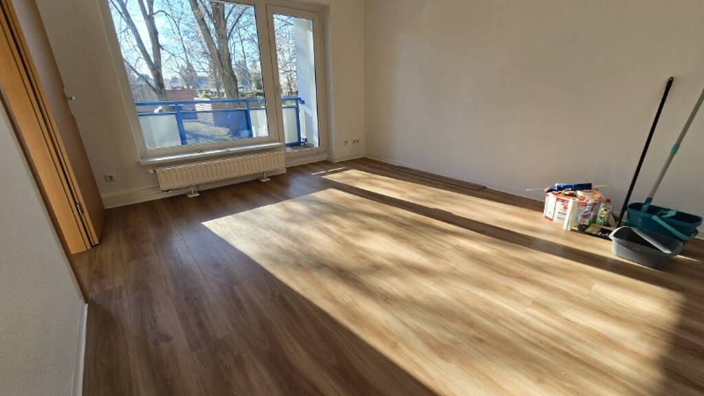 In der gesamten Wohnung ist hochwertiges Laminat verlegt, während die Wände in weißer Raufaser gestrichen sind.