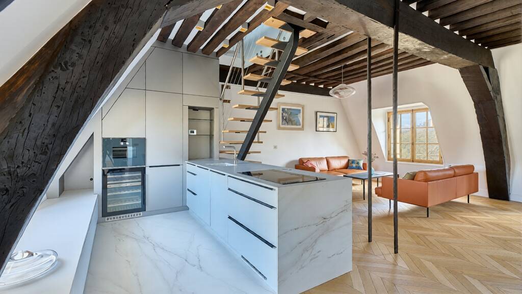 The renovation, carried out using high-end materials, highlights the character of the property while offering optimal living comfort. Facing east and west, the apartment benefits from constant natural light and an unobstructed view of the Place des Vosges, offering a rare sense of openness in this sought-after area.