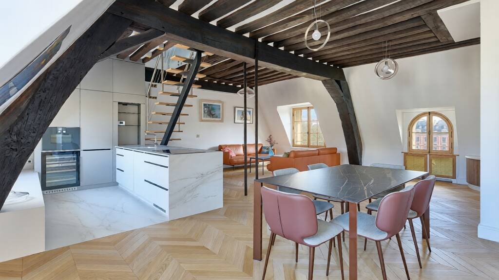 Paris 4th - In the heart of one of Paris's most iconic architectural ensembles, this five-room duplex apartment occupies the third floor of the prestigious Hotel de Chaulnes, a listed historical monument and a building steeped in history bordering the Place des Vosges.