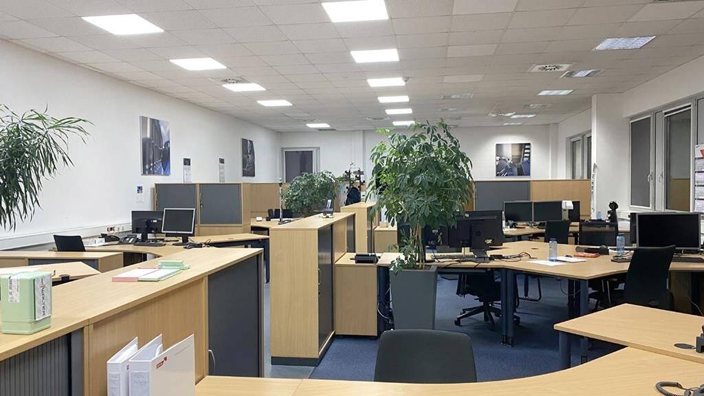 Büroflächen Die den Produktionshallen vorgelagerten oder in diesen integrierten Büroräume befinden sich in einem funktionalen und gepflegten Zustand. Die Büros im vorgelagerten Verwaltungsgebäude sind modern bis anspruchsvoll gestaltet. Akustikdecken mit integrierten LED-Leuchten. Glasfasernetz. Überwiegend leicht zu reinigende PVC- bzw. Vinylböden Die Anmietung oder Übernahme von Büromöbeln ist möglich.