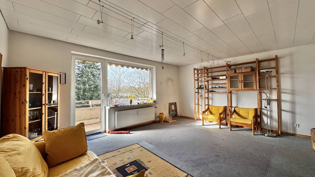 Das großzügige Wohnzimmer bietet direkten Zugang zum sonnigen Balkon mit Südausrichtung, der viel Licht und eine angenehme Aufenthaltsqualität bietet. Eine vorhandene Markise sorgt bei Bedarf für angenehmen Schatten.