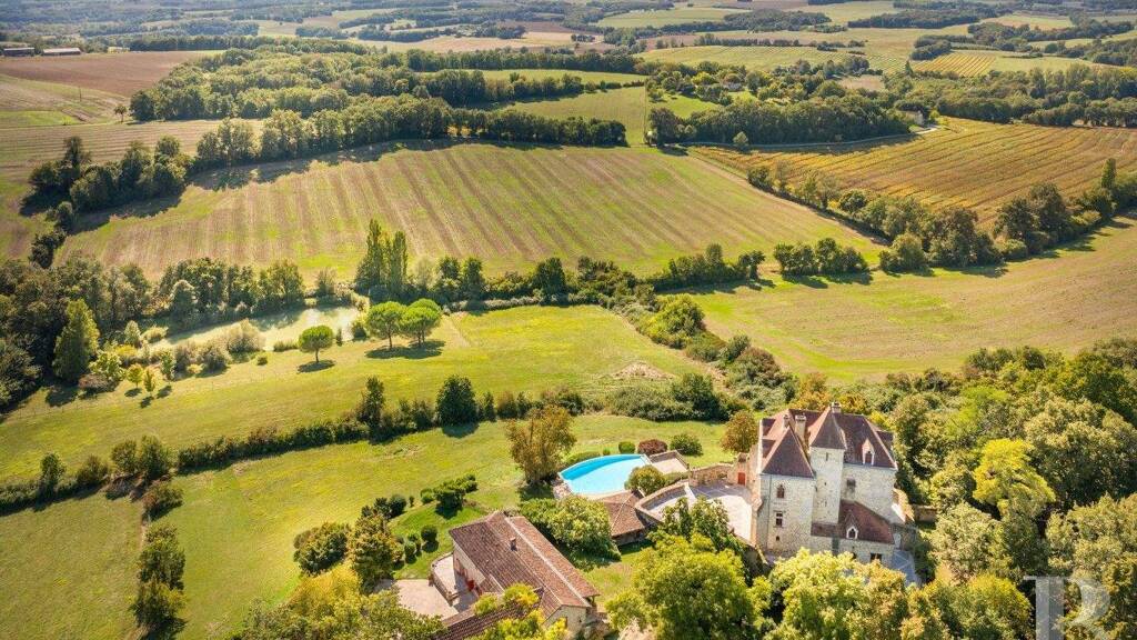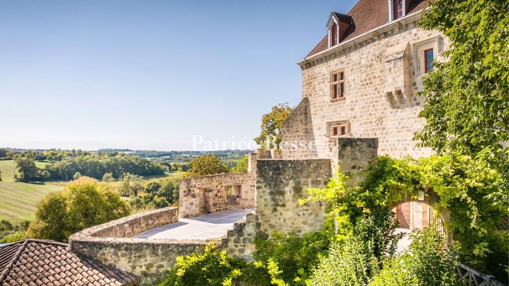 It has four storeys and is topped by pavilion roofs covered with flat tiles. It is surrounded by a terrace paved with stone slabs and the walls of the dry moat over which crosses the former drawbridge. Resembling the prow of a ship, it overlooks the rolling countryside to the south, boasting views as far as the Pyrenees. Around sixty metres from the first outbuilding is a second one. This longhouse is surrounded by fenced fields and is home to a house and stables. A farm hangar open on one side completes the estate's buildings. A private access road leads to this part of the estate, which is separated from the main dwellings by thick vegetation. Below the castle, on the hillside, there is an infinity pool around which stands a large, paved stone terrace boasting an amazing, covered summer kitchen built into the rock at the end of the dry moat. The estate's land spreads to the man-made lake at the bottom of the valley and onto its slopes.