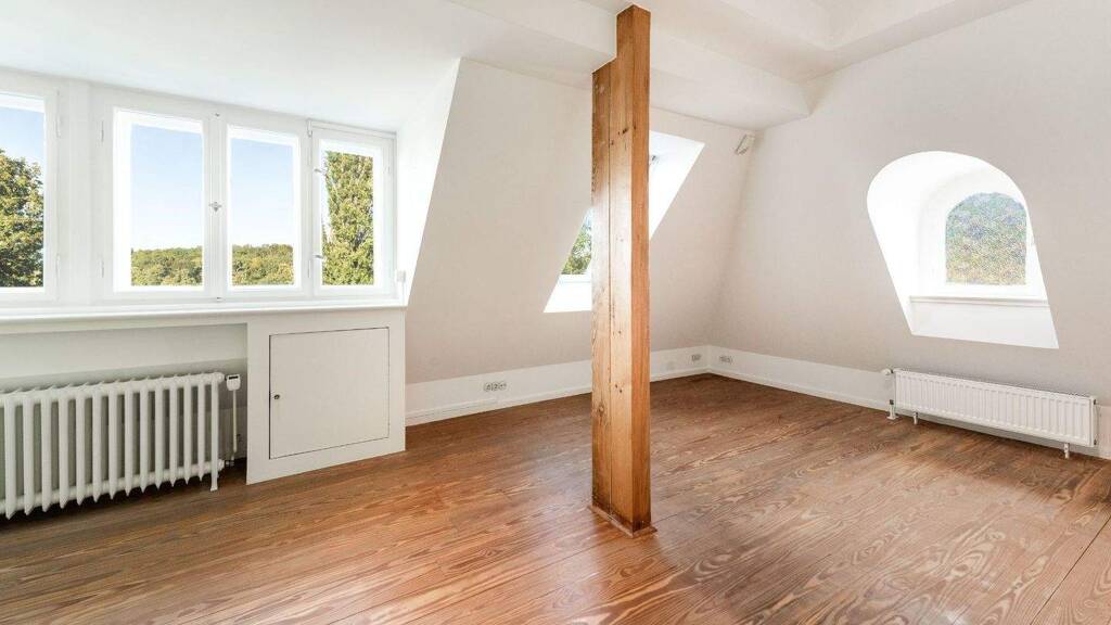 The attic is ideal as a children's or guest area. Two very spacious rooms, a charming "grandmother's room," a library or studio, a bathroom, and a practical dressing room offer a wide range of uses. A spiral staircase leads to the lovingly converted "star room" in the attic-a private retreat with a view over the treetops into the distance along the sparkling waterfront.